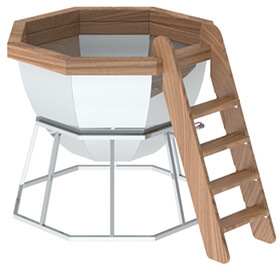 Борта изготовлены из прочной и целебной древесины кедра, чан оборудован удобными деревянными сидениями, лестница оснащена функцией противоскольжения, а для защиты ног установлен подножник (деревянная решетка). Подставка может быть изготовлена нержавеющей стали или термостойкой.