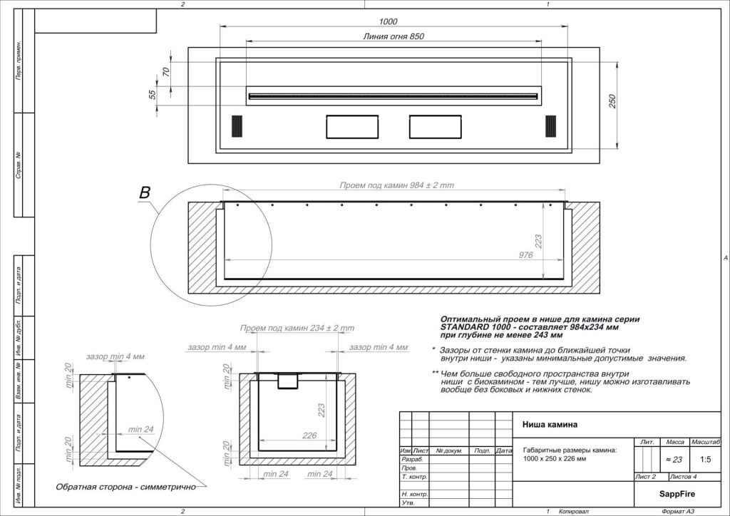 Инструкции, чертежи, документы - Автоматический биокамин SappFire Standard (топливный блок 1000)