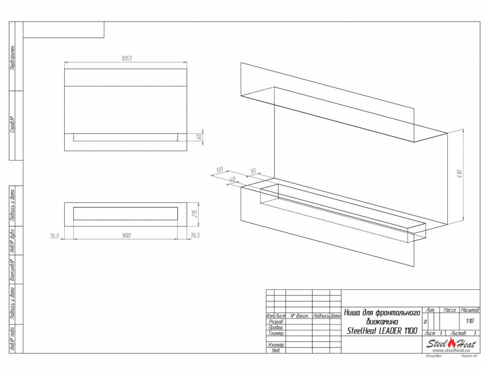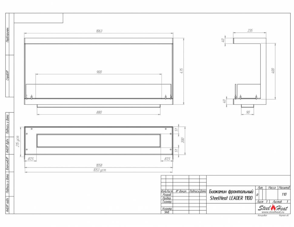 Инструкции, чертежи, документы - Биокамин фронтальный SteelHeat Leader 1100