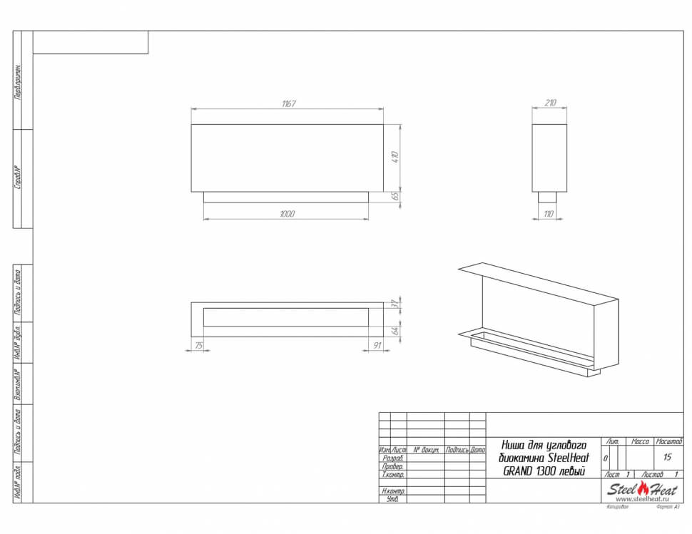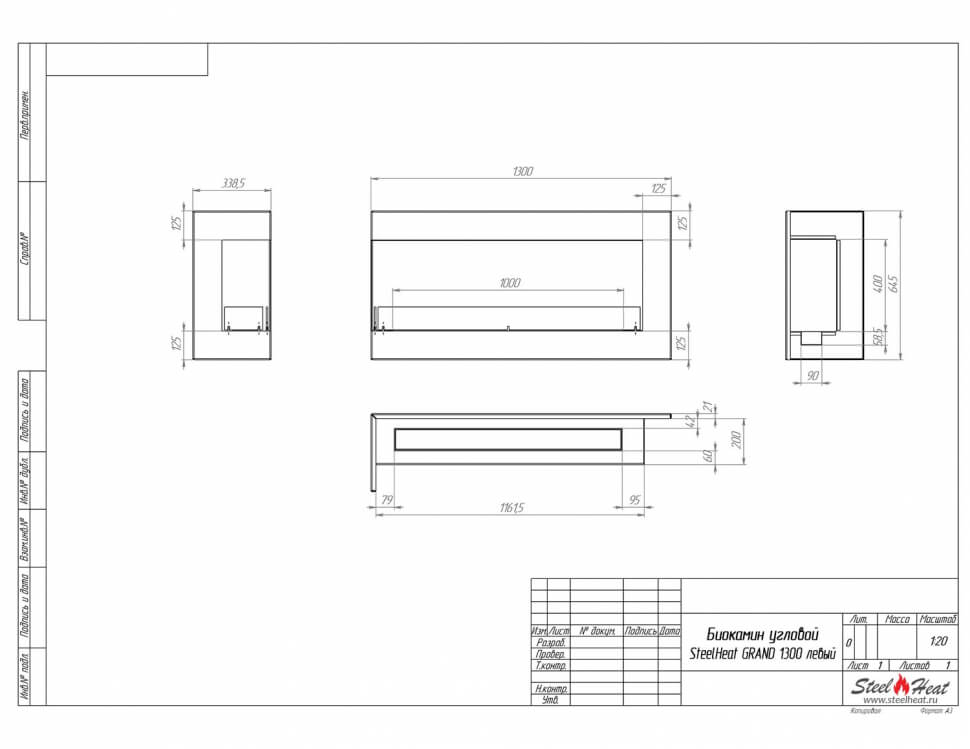 Биокамин угловой SteelHeat Grand 1300 (стандарт, левый)