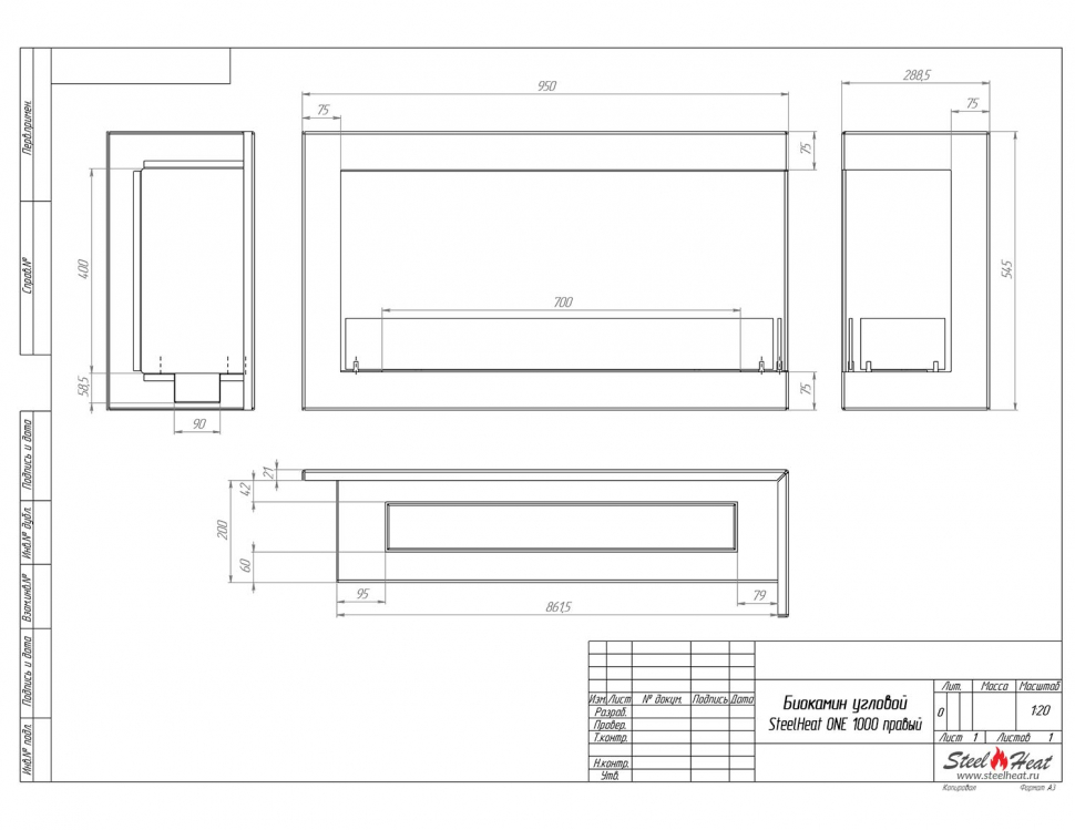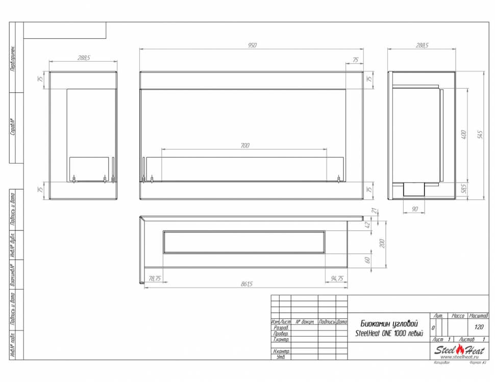 Биокамин угловой SteelHeat One 1000 (стандарт, правый)