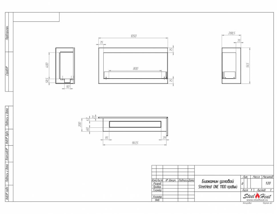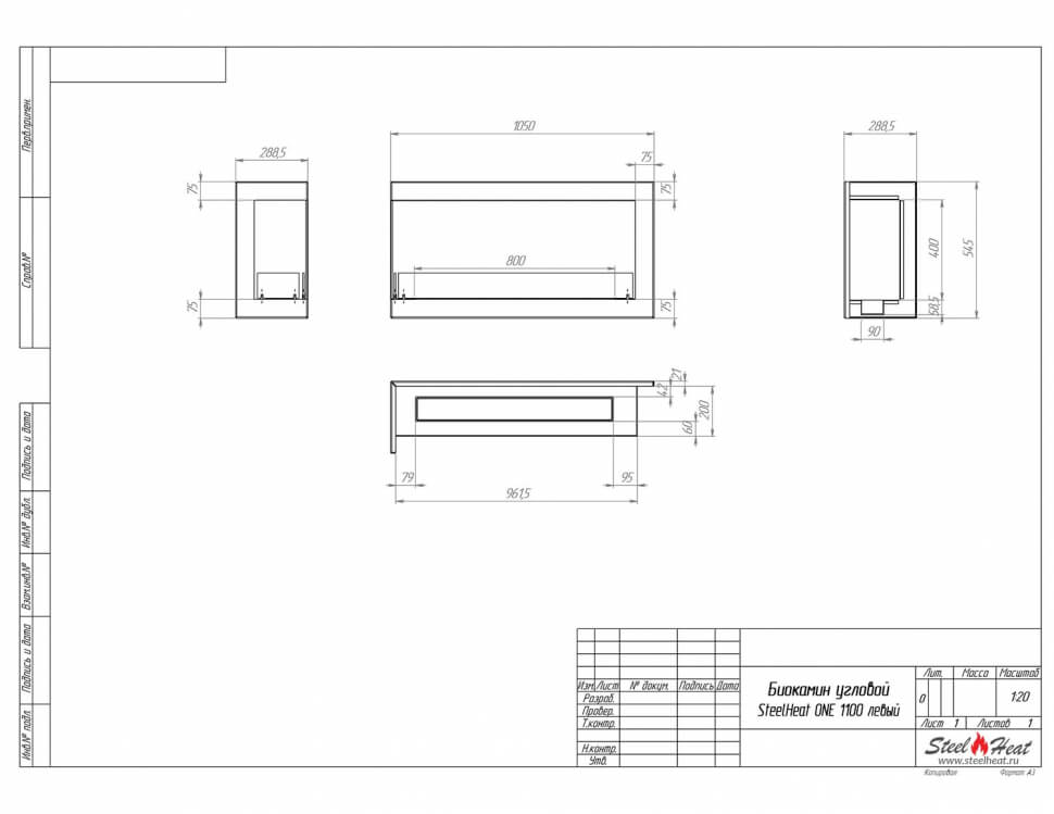 Биокамин угловой SteelHeat One 1100 (стандарт, левый)
