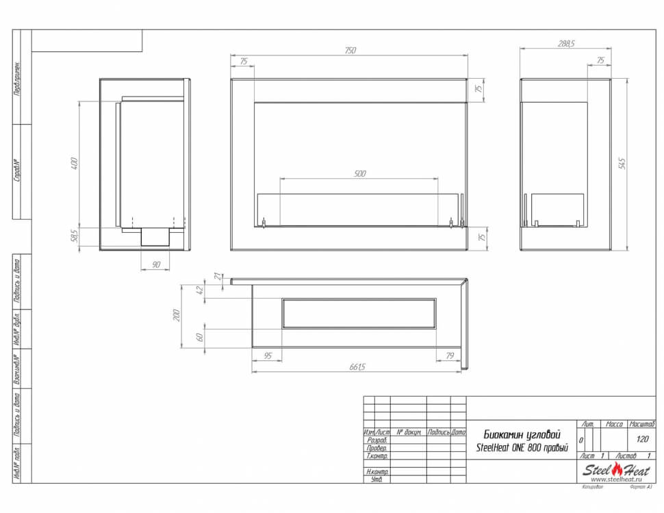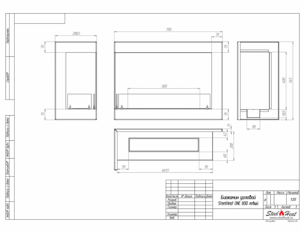 Биокамин угловой SteelHeat One 800 (стандарт, левый)