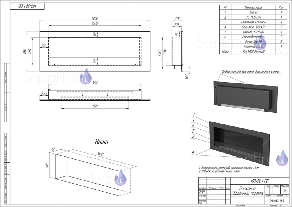 Инструкции, чертежи, документы - Настенный биокамин SappFire Mercury 1800 Black
