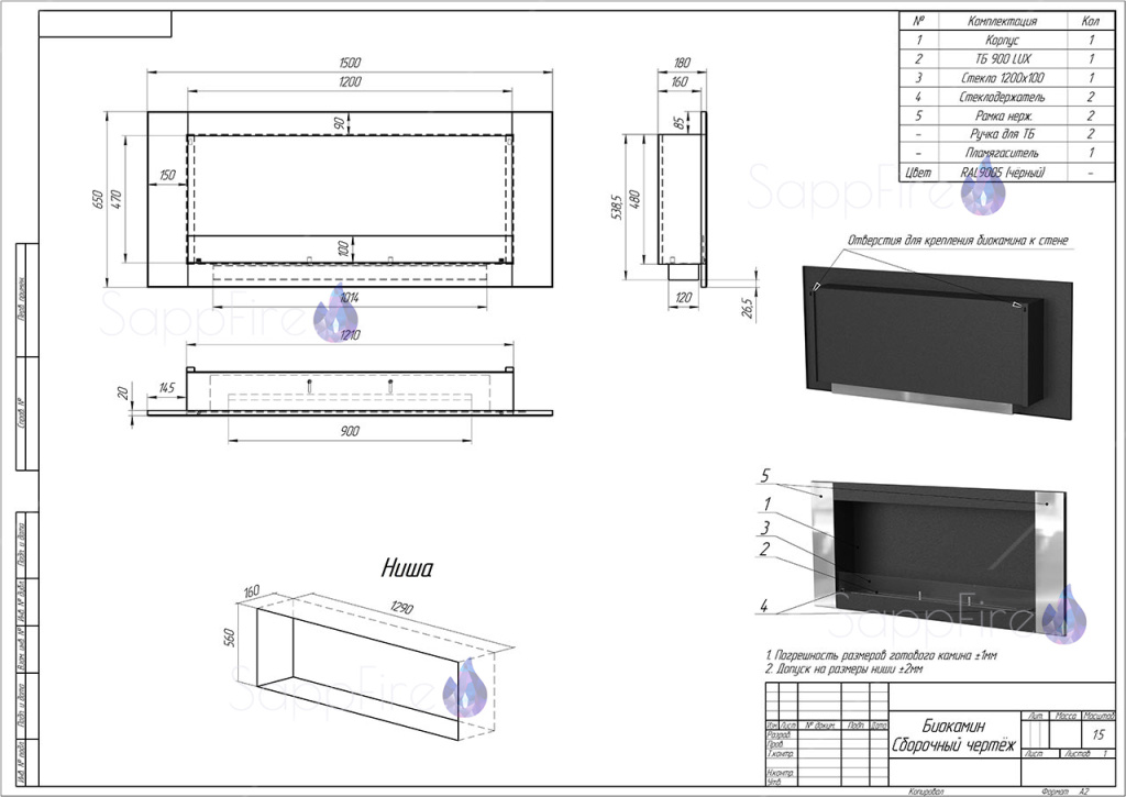 Инструкции, чертежи, документы - Настенный биокамин SappFire Mercury Horizontal 1500