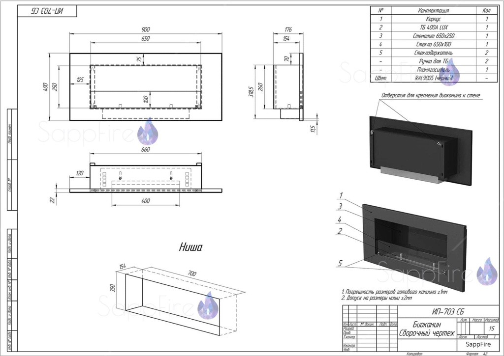 Инструкции, чертежи, документы - Настенный биокамин SappFire Saturn 900