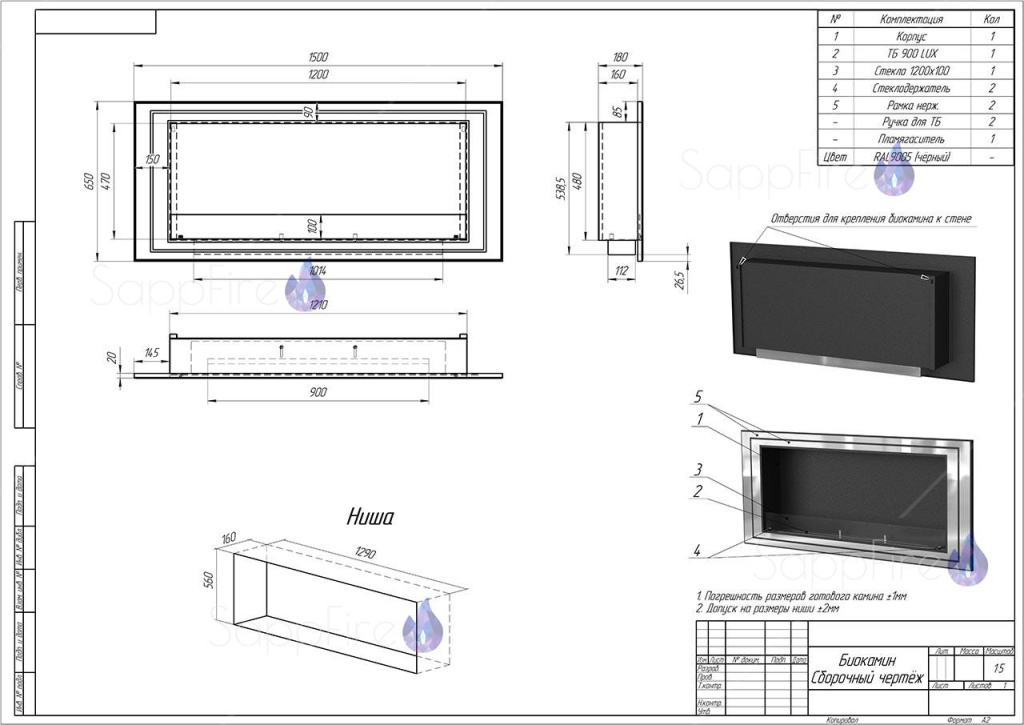 Инструкции, чертежи, документы - Настенный биокамин SappFire Saturn 1500