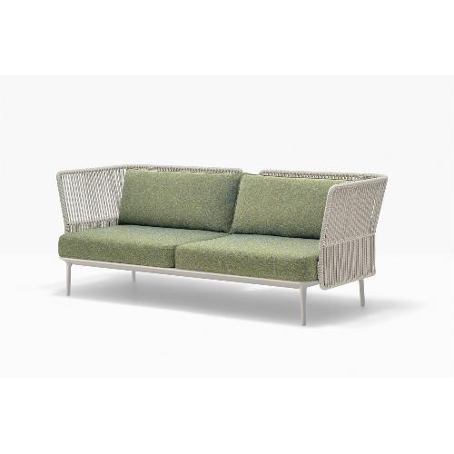Версия Reva Cocoon с низкой спинкой, обладает отличительной особенностью в виде каркаса из нержавеющей стали, переплетенным веревкой из устойчивого к атмосферным воздействиям полипропилена, что придает всей коллекции по-настоящему естественный вид. Элемент каната, на 100% изготовленный в Италии опытными мастерами, обеспечивает жизненно важное уединение, сохраняя при этом предмет мебели воздушным и ярким благодаря более толстому плетению в нижней части и более свободному в верхней части. Прямой диван с каркасом из экструдированного алюминия, на концах которого установлены четыре конические ножки из литого под давлением алюминия. Ощущение обволакивания усиливается мягкими подушками, которые опираются на конструкцию.