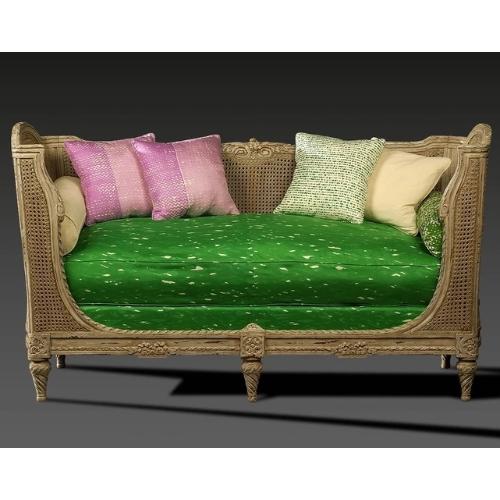 - Диван выполнен в стиле Людовика XV, который представляет собой нечто среднее между рококо и классицизмом. Предпочтение отдается прямым линиям, господствует ясность и гармоничность пропорций, декор лаконичен. Присутствуют античные орнаментальные мотивы, обогащенные реалистически трактованными цветами и ветвями. Мебель стиля Людовика XVI характеризуется простой и спокойной формой, строгой геометрией, прямыми длинными ножками и завышенными каннелюрами.