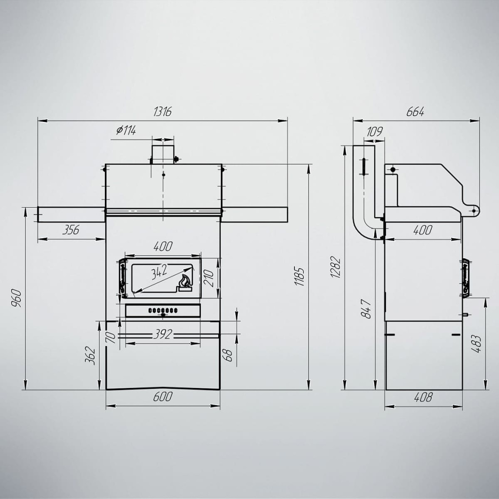- Длина топочной камеры: 400 - 600 мм
