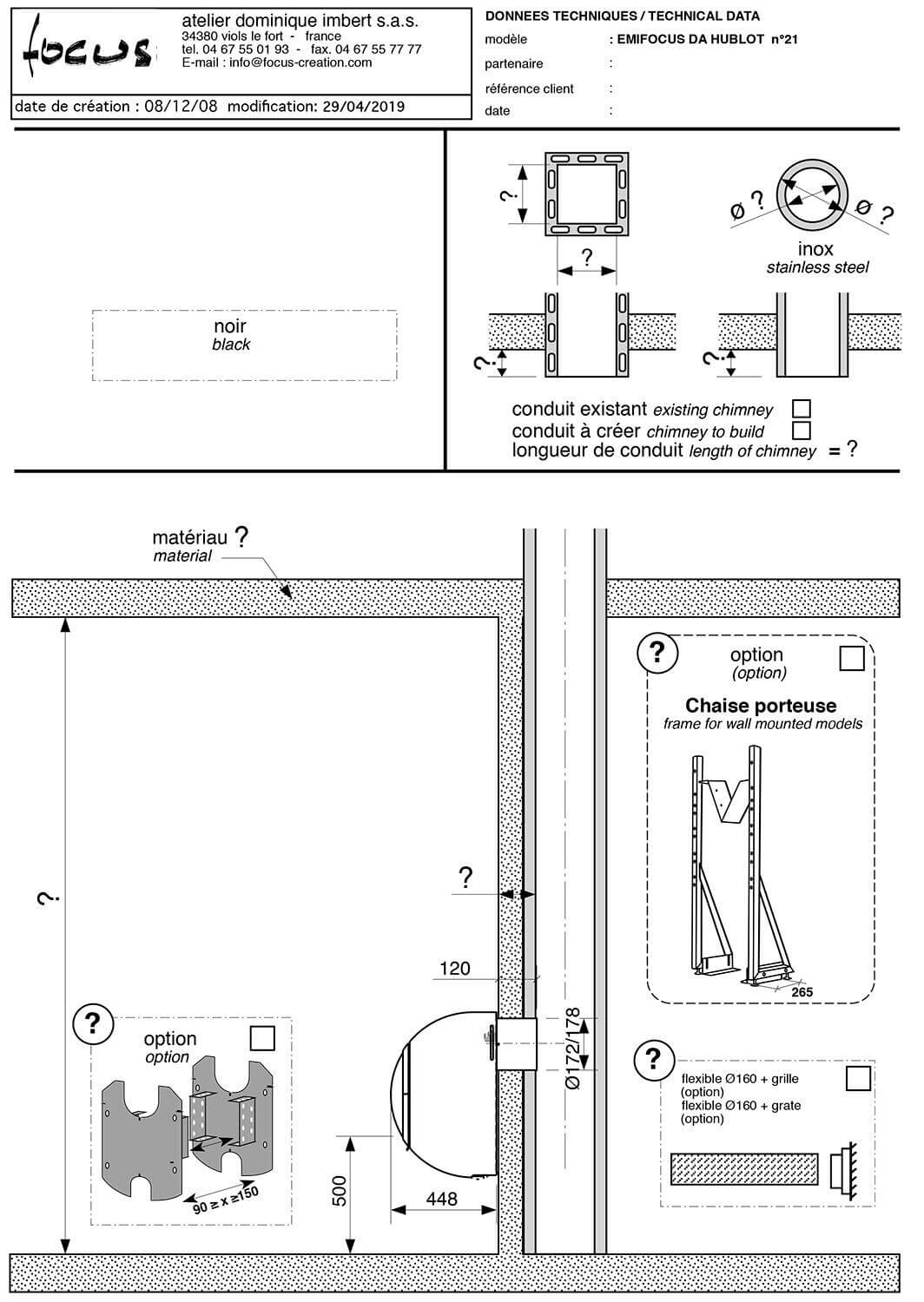 Инструкции, чертежи, документы - Готовый камин Focus Emifocus с выпуклой стеклянной дверцей, труба в стене