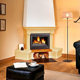 Угловой камин из золотисто-песочного камня Edelroc с топочной плитой из кирпича.