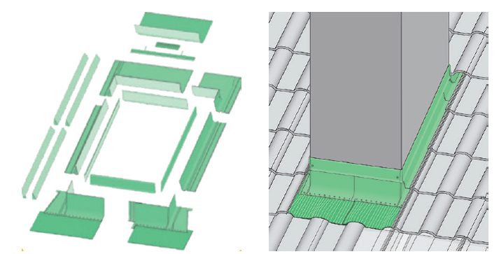 Эластичный фартук в нижней части оклада позволяет установить его в кровельные покрытия с углом наклона от 15° до 60° и с высотой профиля до 60мм. Комплекты примыкания поставляются в коробке с инструкцией внутри.