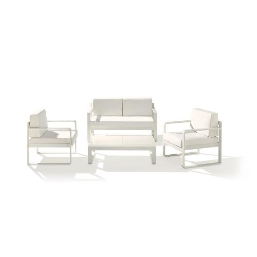Комплект Capri состоит из дивана, кресел и журнального столика. Каркас мебели выполнен из алюминия с порошковым покрытием, подушки на диване и креслах - из стойкого к истиранию и ультрафиолетовому излучению олефина, столешница журнального столика - из стекла. Такой комплект украсит лаунж-зону возле бассейна или на террасе загородного дома.