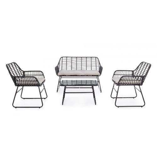 Плетеный комплект лаунж мебели Burrel с удобными подушками на сиденьях станет отличным выбором для обустройства летних площадок на свежем воздухе. Набор разработан для комфортного размещения четырех человек и создания уютной обстановки, располагающей для приятного времяпрепровождения в кругу друзей и близких. Каркас всей мебели представлен в виде полозьев из стали, что обеспечивает максимальную устойчивость и надежность.