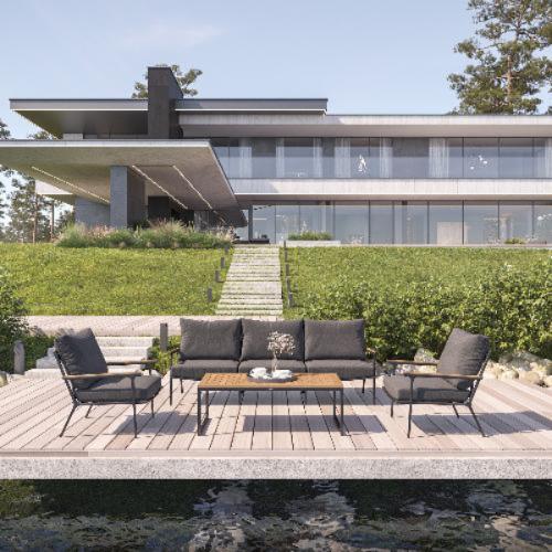 Особенности: подлокотники и планки столешницы из благородного тика, уличная ткань (олефин), съемные чехлы подушек на "молнии", дополнительно можно приобрести комплект защитных чехлов