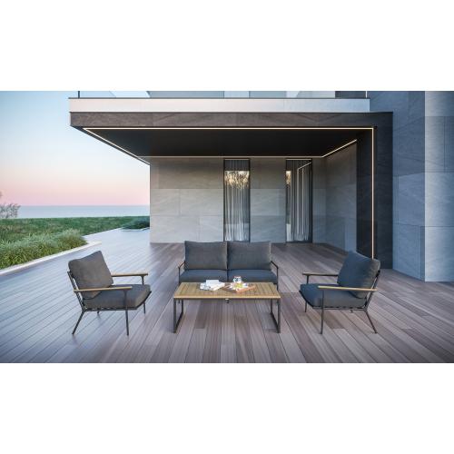 Особенности: подлокотники и планки столешницы из благородного тика, уличная ткань (олефин), съемные чехлы подушек на "молнии", дополнительно можно приобрести комплект защитных чехлов