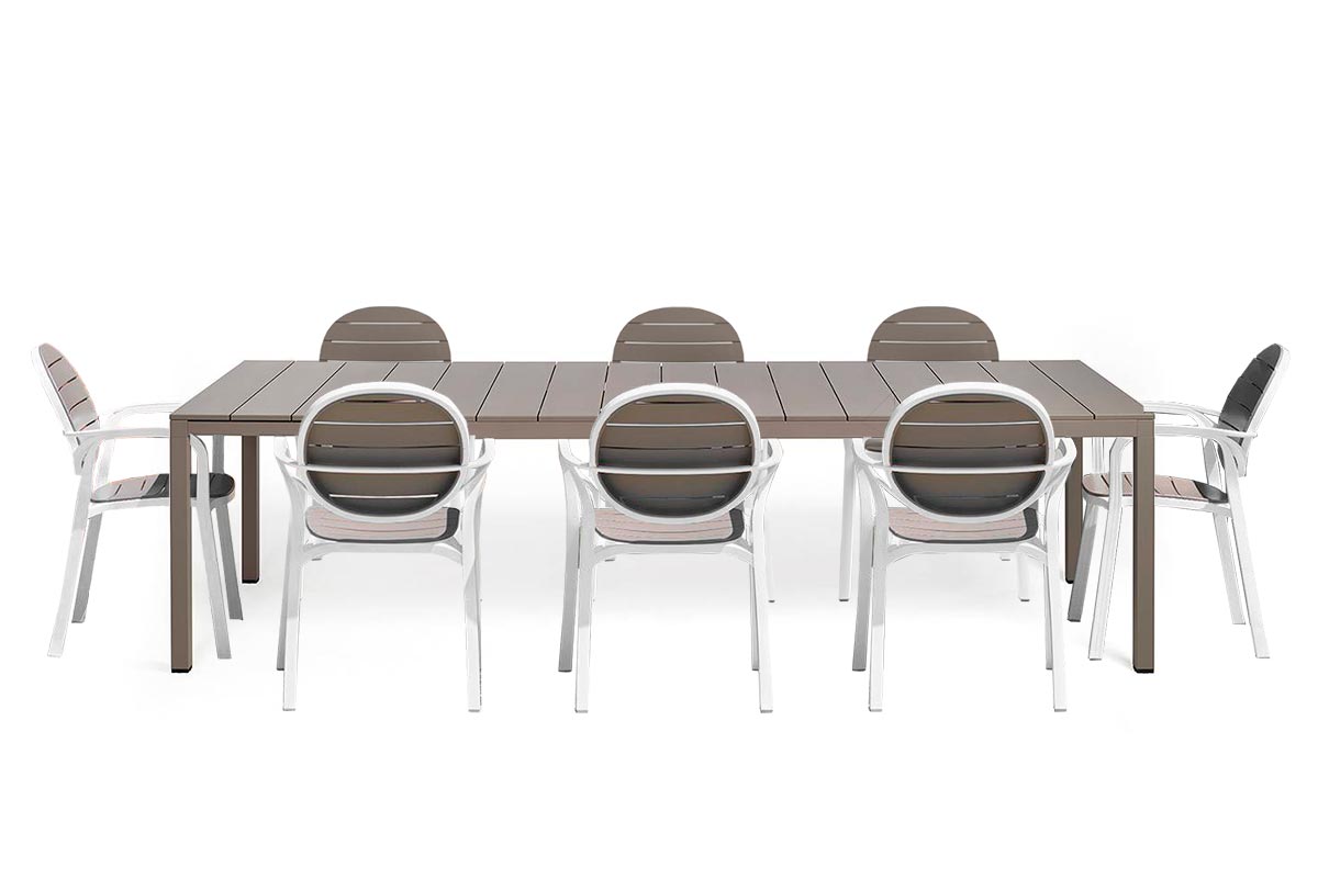 Комплект представлен 8 стульями Nardi Palma в сочетании с раздвижным столом Rio