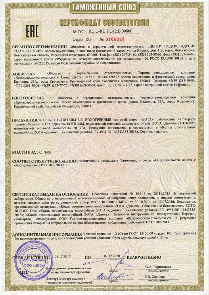 Инструкции, чертежи, документы - Отопительный котел Zota Дымок 14М