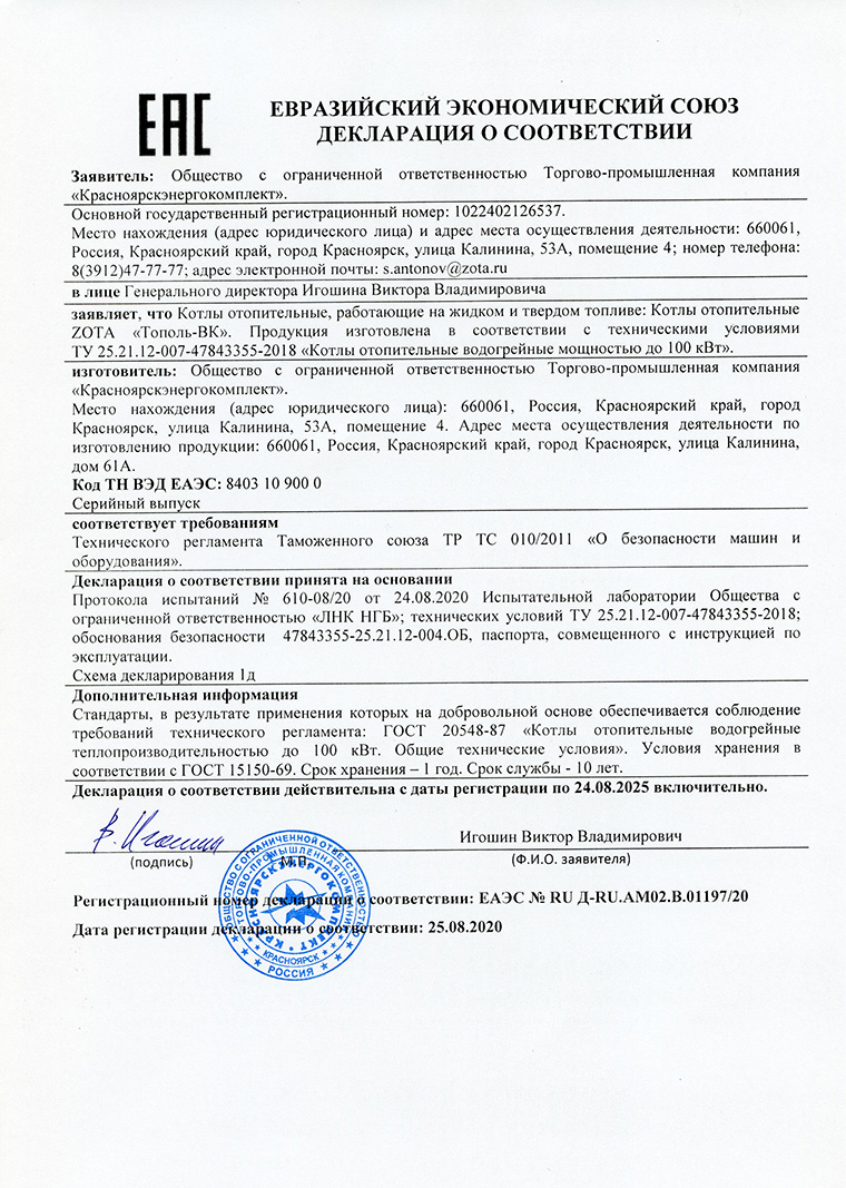 Инструкции, чертежи, документы - Твердотопливный котел Zota Тополь-16ВК