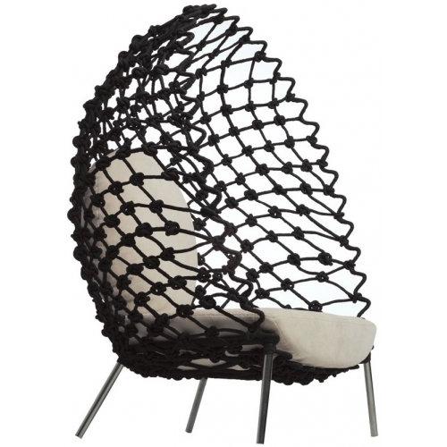Каждый поворот и узел кресла Dragnet повествует историю рыбака, отправившегося в море за своим ежедневным уловом. Кресло сплетает историю, вдохновленную круглой сетью, раскинувшейся в воздухе, изящно касаясь того слоя океана, где взаимодействуют ветер и волны. Это единственное движение, когда вы забрасываете рыболовную сеть, открывающую красивую паутину решетчатой конструкции, является ритмическим источником вдохновения коллекции Dragnet. Привлекательная сетка, сделанная из скрученного роупа и проволоки, тщательно обернутой вокруг стальной рамы в форме кокона.