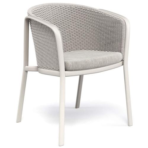 Каркас кресла выполнен из трубчатого алюминия. Сиденье изготовлено из листа алюминиевого сплава, который вытягивается для придания ровной формы, а затем крепится к алюминиевой раме с помощью структурной сварки, выполненной с использованием технологии TIG, которая обеспечивает особое сопротивление, а также лучший стандарт с точки зрения прочности и эстетики. Структура стальной спинки поддерживает декоративные узоры, предлагаемые в различных материалах. Все выбранные материалы гарантируют длительную стойкость и стабильность цвета.