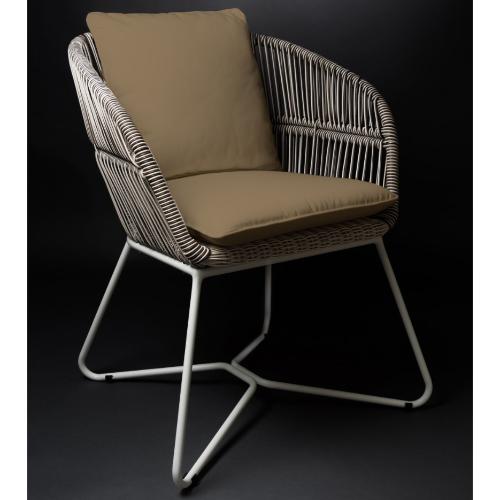 Каркас выполнен из алюминия, окрашенного в белый цвет. Плетение изготавливается вручную из высококачественного полираттанового волокна REHAU® (полиэтилен высокой плотности).