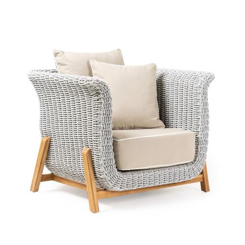 Кресло из серии Zante изготовлено на прочной тиковой основе и вручную сплетено из веревки Rehau высочайшего качества. Внутренний каркас изготовлен из алюминия, окрашенного эпоксидной порошковой краской. Изысканные и обволакивающие линии, очень высокое качество материалов, тонкий баланс между дизайном и традицией, между классическими закругленными формами и игрой материалов делают это садовое кресло Zante дизайнерским продуктом, подходящим для обустройства как внутренних, так и внешних пространств. Как и другие изделия фабрики RosaDesign, оно не боится непогоды и перепадов температуры благодаря сертифицированному плетению волокна.
