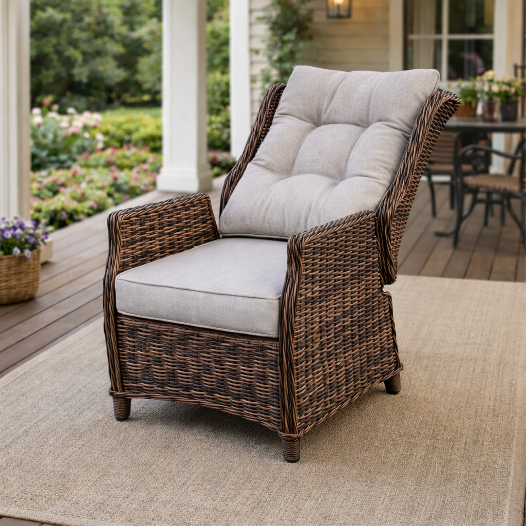 3. Ручное плетение из ротанга (сфера) - благородство коричневого Коричневый ротанг с текстурой «сфера» создаёт эффект объёмного, живого полотна. Это не просто плетение - это ручная работа, которая придаёт креслу характер. Материал не выцветает, не расслаивается, не боится дождя и снега. Он просто остаётся красивым всегда.