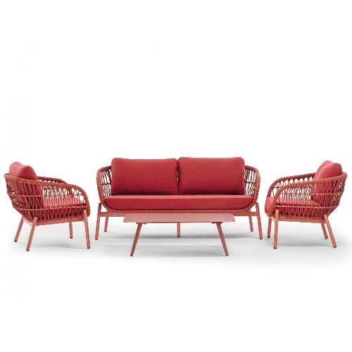 Уличный комплект Elba состоит из двухместного дивана, двух кресел и журнального столика со столешницей из алюминий. Алюминиевый каркас оплетен синтетическим роупом, мягкие подушки на сиденьях и спинках со съемными чехлами из олефина, устойчивого к загрязнениям и ультрафиолетовому излучению.