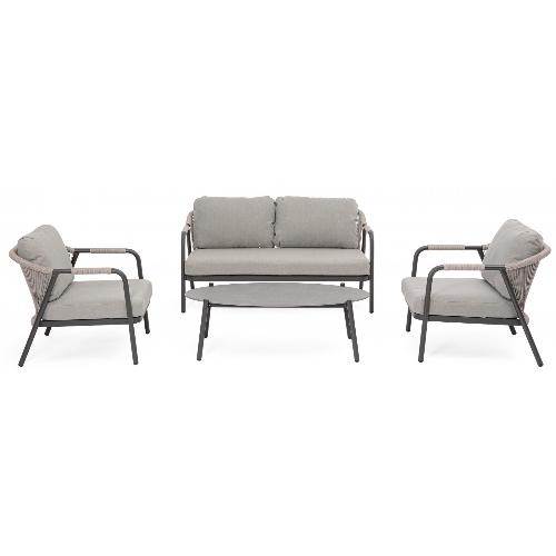 Miravet – комплект лаунж мебели из высококачественных материалов. Изысканная конструкция из алюминия с высокопрочным полиэстерным порошковым покрытием гарантирует исключительную прочность и устойчивость к непогоде. Плетеные элементы из роупа, придают комплекту неповторимый шарм и легкость. А благодаря лаконичному и элегантному дизайну он с легкостью вписывается в разнообразные стили площадок, придавая им современный, но в то же время теплый характер.