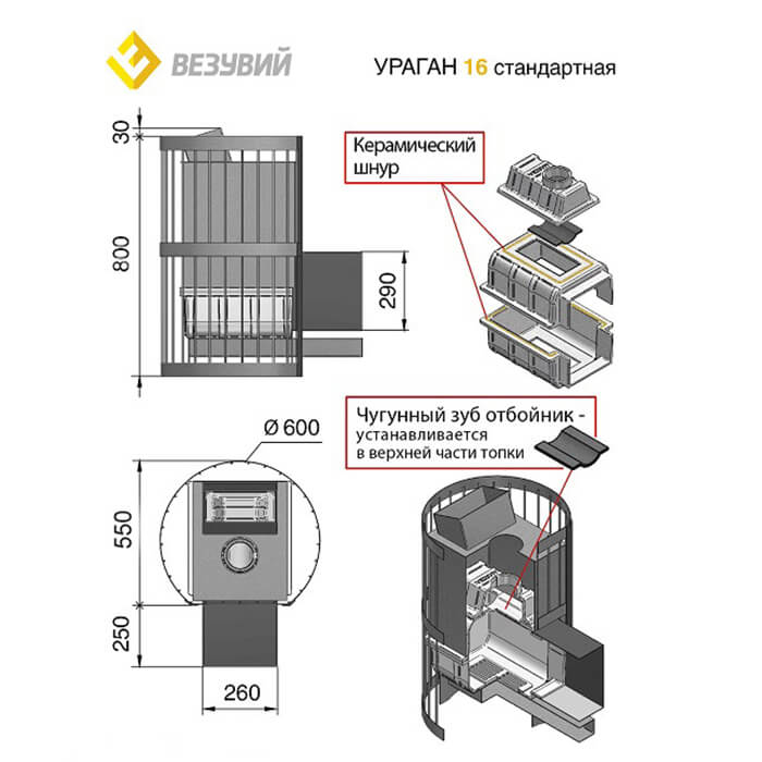 Инструкции, чертежи, документы - Банная чугунная печь Везувий Ураган Ковка 16 (224)