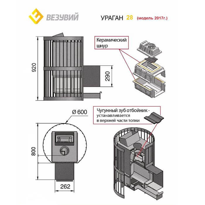 Инструкции, чертежи, документы - Банная чугунная печь Везувий Ураган Ковка 28 (270)