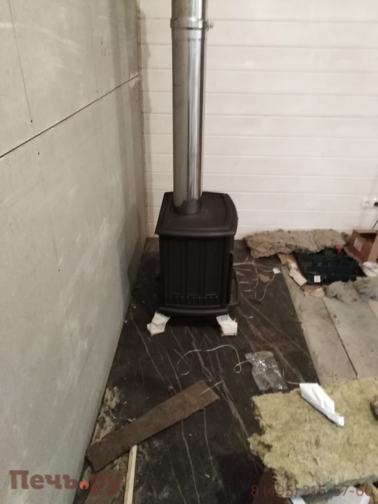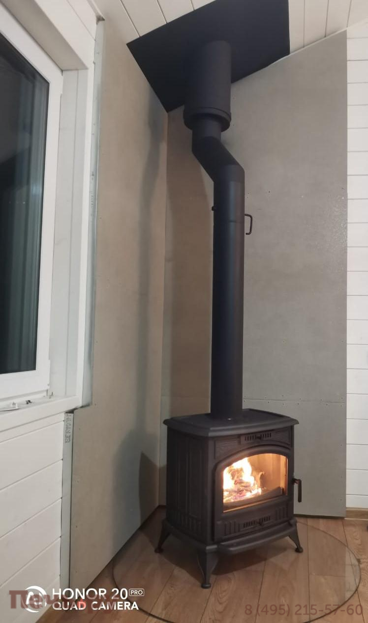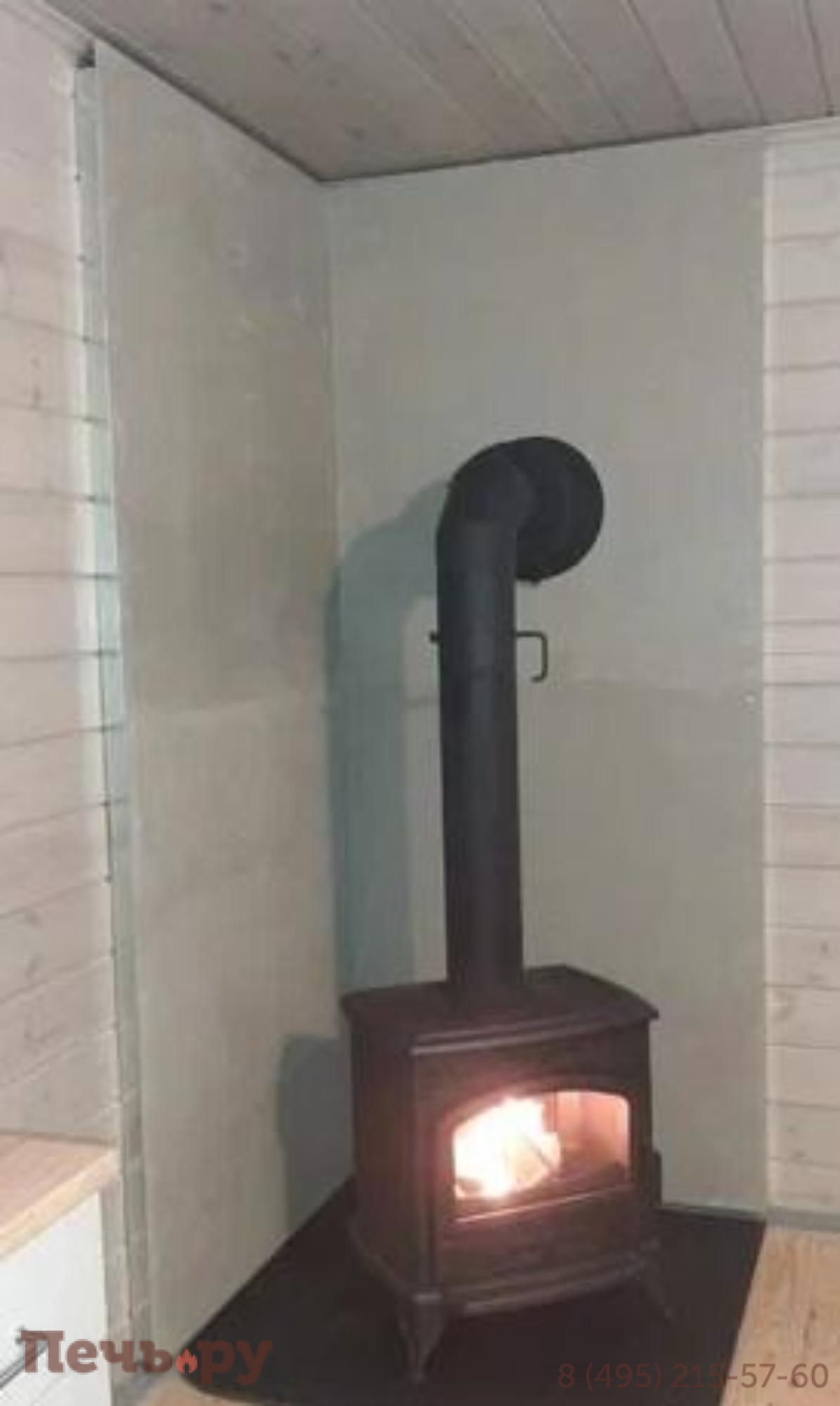 Установили печь в деревянном доме. На стене и под печью положили теплоизоляционные листы. Комната 25 кв.м. и кухня 18 кв.м. Печь чугунная, дома тепло. И приятно, что стекло осталось чистым после протопки. На дверце по всему периметру проложен шнур.