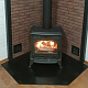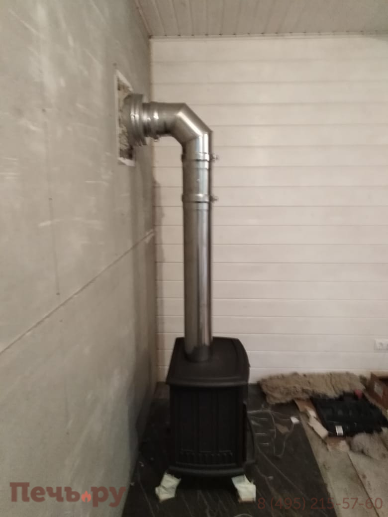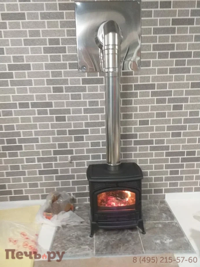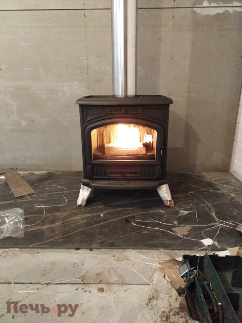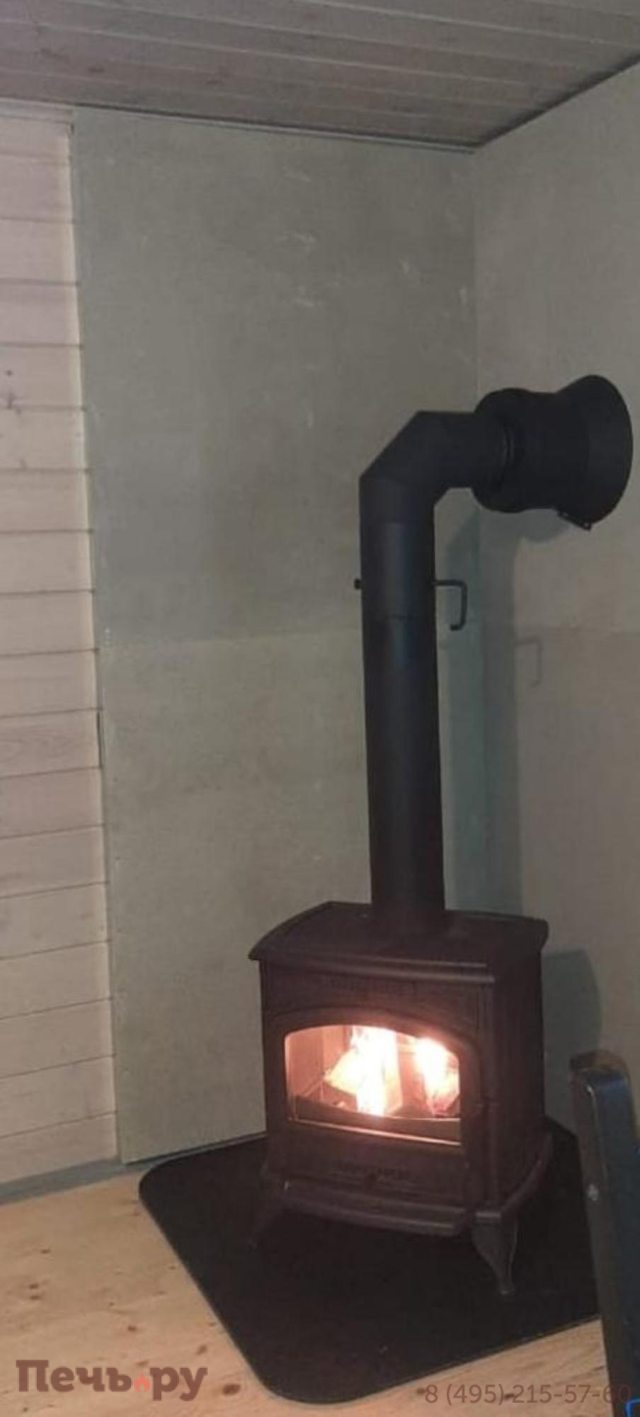 Установили печь в деревянном доме. На стене и под печью положили теплоизоляционные листы. Комната 25 кв.м. и кухня 18 кв.м. Печь чугунная, дома тепло. И приятно, что стекло осталось чистым после протопки. На дверце по всему периметру проложен шнур.