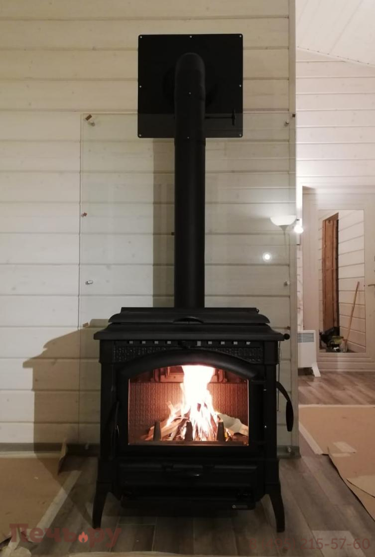 стекло, к сожалению, чистым не будет - очень легко затуманивается копотью, особенно с березы. Рассекатели огня сверху внутри печи вытаскиваются и вставляются обратно - один раз за 7 лет почистили трубу от улетевших туда частиц золы. Отапливает дом 130 м2 при расположении в центре дома и открытых дверях в комнаты. Труба выполнена одноконтурной около 7 м и только у кровли выполнен переход на сэндвич.