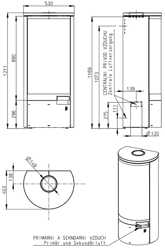 высота: 1211 мм, ширина: 530 мм, глубина: 403 мм.