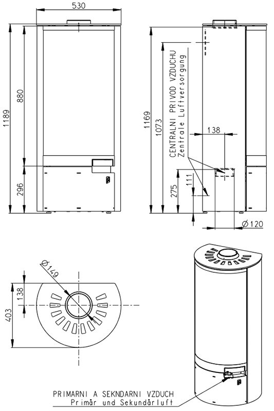 высота - 1189 мм, ширина - 530 мм, глубина - 403 мм.