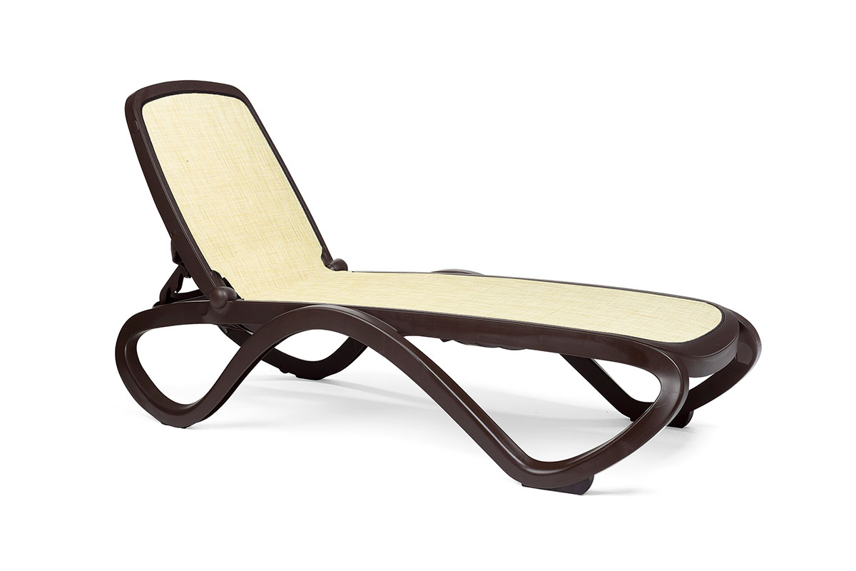 Элегантный шезлонг из высокопрочного пластика коричневого цвета кофе с мягкой обивкой из дышащей ткани бежевого цвета - стильное решение премиум класса от итальянских дизайнеров!
