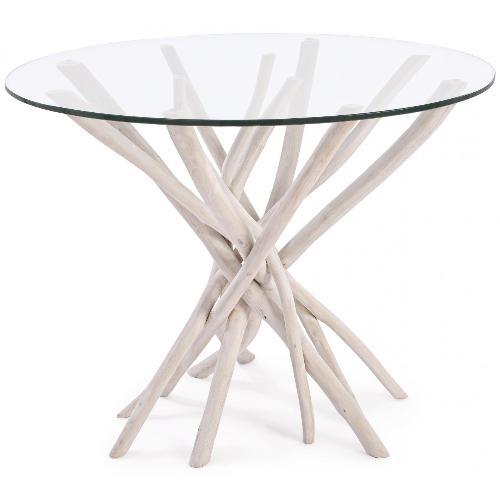 Круглый стеклянный стол Sahel в нестандартном исполнении. Подстолье из переплетенных элементов беленого тика делает модель неповторимой. Столешница изготовлена из закаленного прозрачного стекла. Дерево покрыто воском. Столик предназначен для использования только внутри помещения.