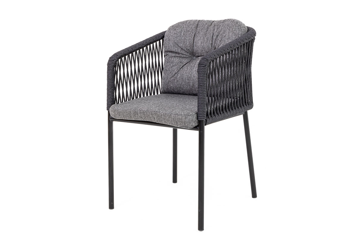 Спинка стула выполнена плетением роуп. Роуп – это искусство переплетения синтетических лент. Тренд последних лет в дизайне мебели для загородных участков, кафе и ресторанов, отелей.