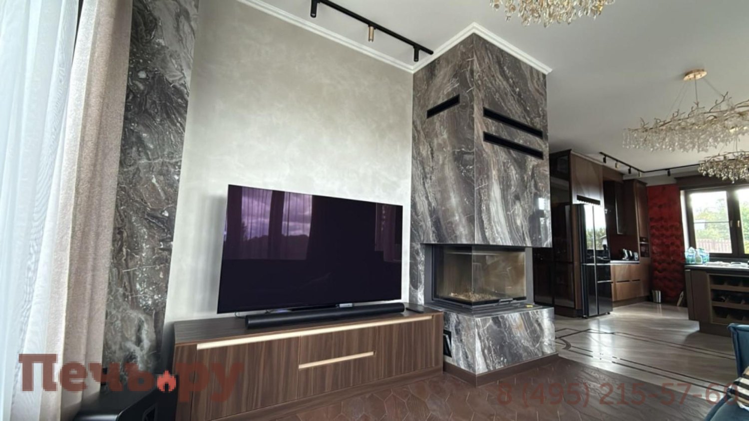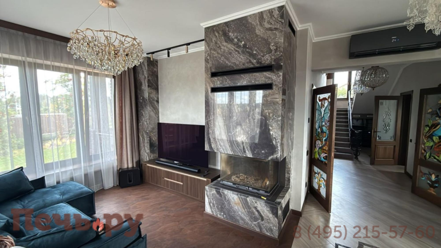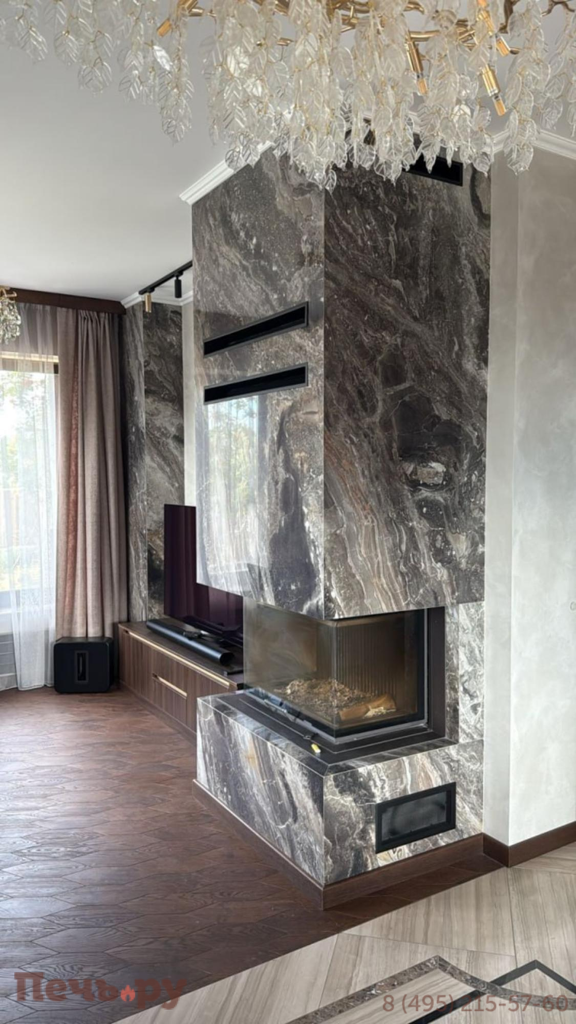 В камине с классическим порталом топку-гильотину тоже устанавливают. Чтобы поднятая дверца не задевала облицовку, топку монтируют глубже портала.