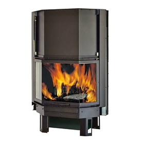 Призматическая топка. Закрытая топка со стальным корпусом и широким обзором огня. Эркерное составное огнеупорное стекло. Очаг с чугунной футеровкой. Плавный подъем дверцы-гильотины. Топка может устанавливаться как с пристенной облицовкой, так и в угловой версии камина.