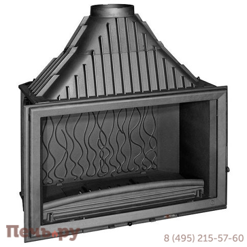 Топка полностью чугунная, увеличенный дымосборник, боковое открывание дверцы. Есть регулировка закрытия дверцы и система "чистое стекло".