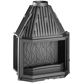 Чугунная топка с цельным призматическим стеклом. Имеет высокий дымосборник, который препятствует поддымлению при открытой дверце. Есть специальная регулировка подачи воздуха, боковое открывание дверцы, система "чистое стекло".