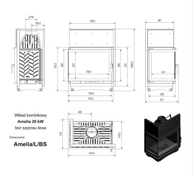 Инструкции, чертежи, документы - Каминная топка Kratki Amelia/L/BS (угловое стекло слева)
