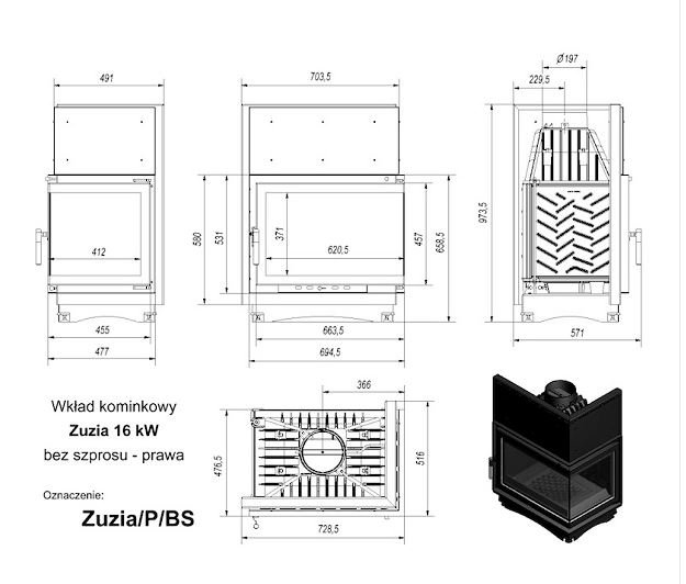 Инструкции, чертежи, документы - Каминная топка Kratki Zuzia/P/BS (угловое стекло справа)