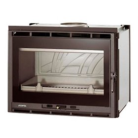 Топка имеет полностью стеклянную переднюю часть (без чугунных вставок). Имеет вмонтированную турбину. Дверца топки открывается вбок. Есть зольник и колосник.