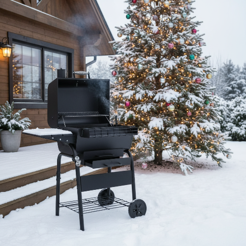 Гриль легко перемещать благодаря двум большим колёсам, а при остановке он устойчив за счёт двух прочных опор. Нижняя полка удобна для хранения угля, топлива и аксессуаров для готовки. А зольник, расположенный спереди, обеспечивает быструю и простую очистку после использования.