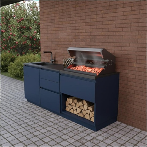 Компактный вариант, при котором мангал, рабочая поверхность и мойка располагаются вдоль одной линии. В таком случае часто используют линейный кухонный модуль, объединяющий рабочую зону и системы хранения. Подходит для небольших пространств, когда проектируется маленькая летняя кухня или мини-кухня под навесом. Отличается простотой реализации и минимальными затратами.
